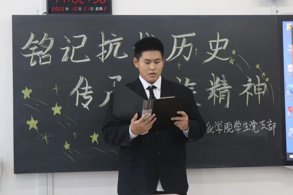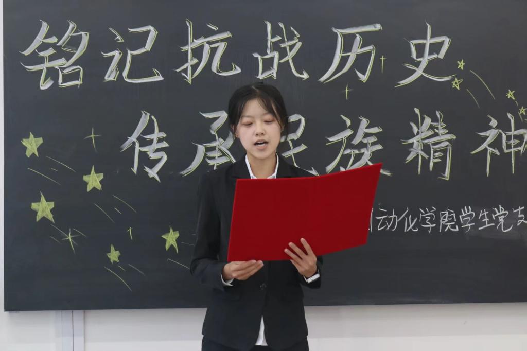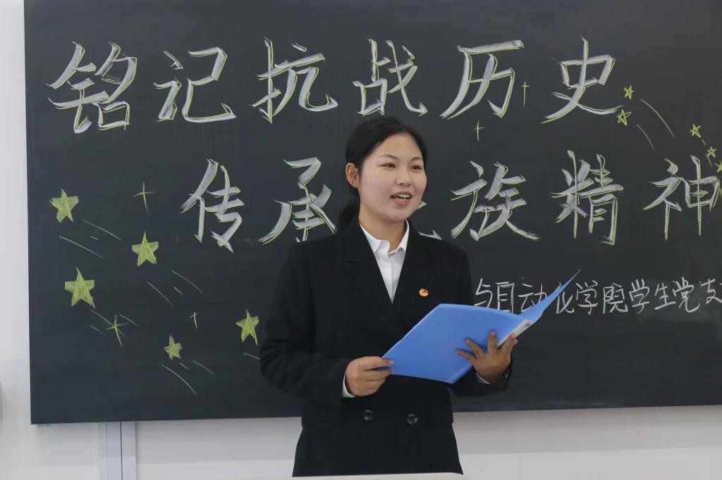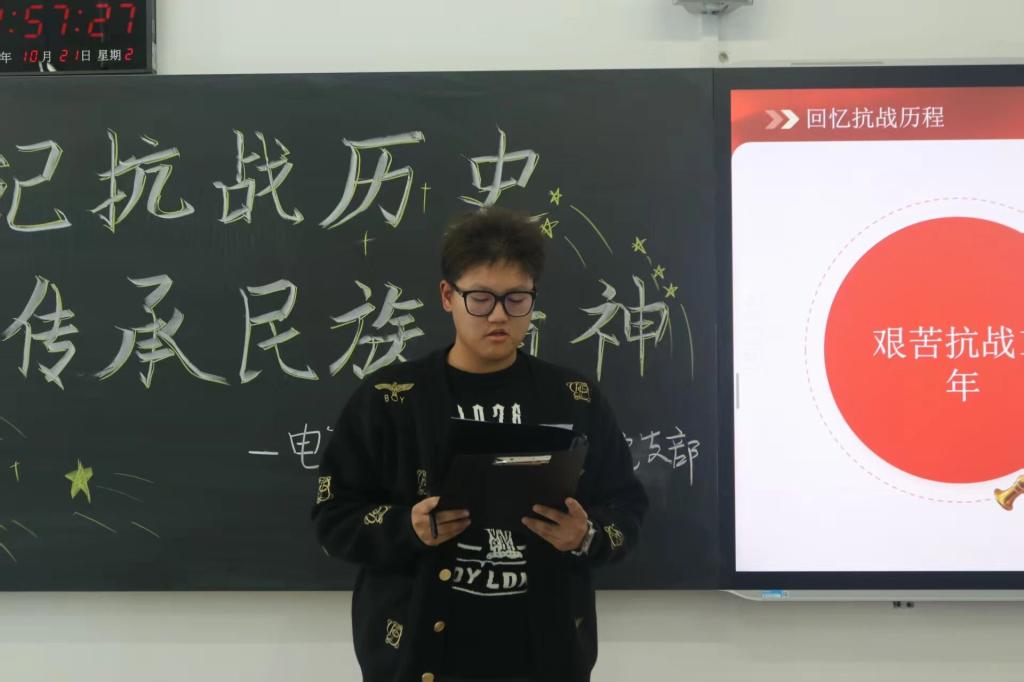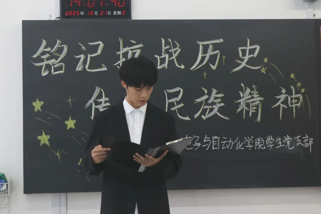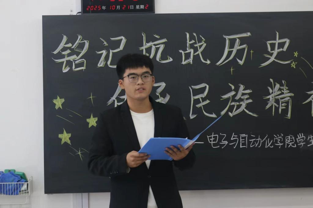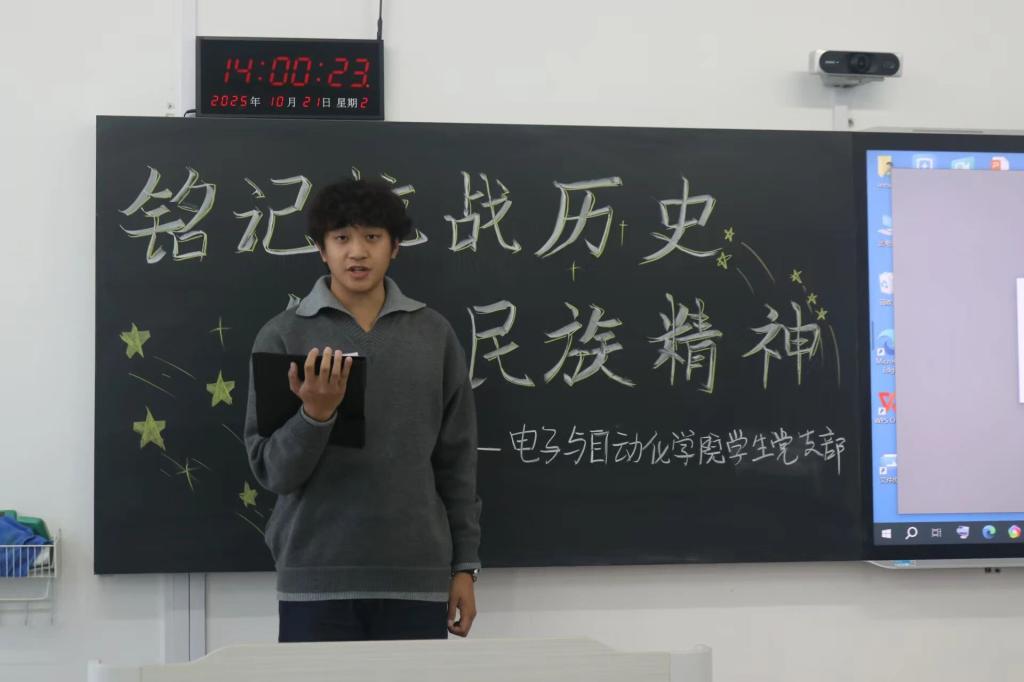 历史的硝烟虽已散去,但抗战先辈用热血铸就的精神丰碑永远矗立。那些浴血奋战的日夜,那些不屈不挠的呐喊,是民族最珍贵的记忆,更是我们前行的力量源泉。特此电子与自动化学院学生党支部于2025年10月21日下午2:00在思贤楼307教室举办以“铭记抗战历史,传承民族精神”为主题的演讲比赛。