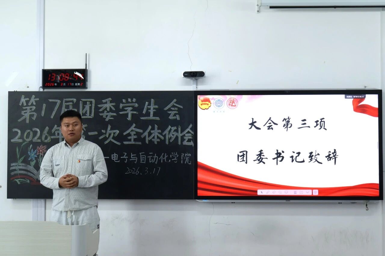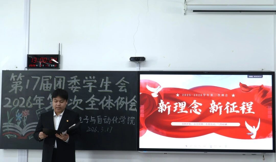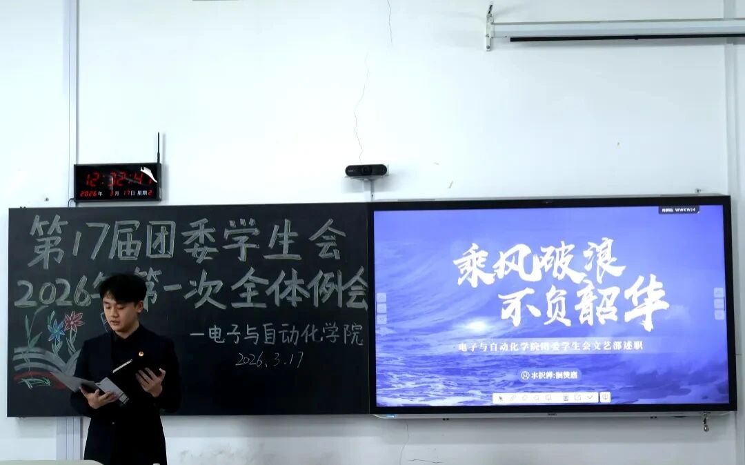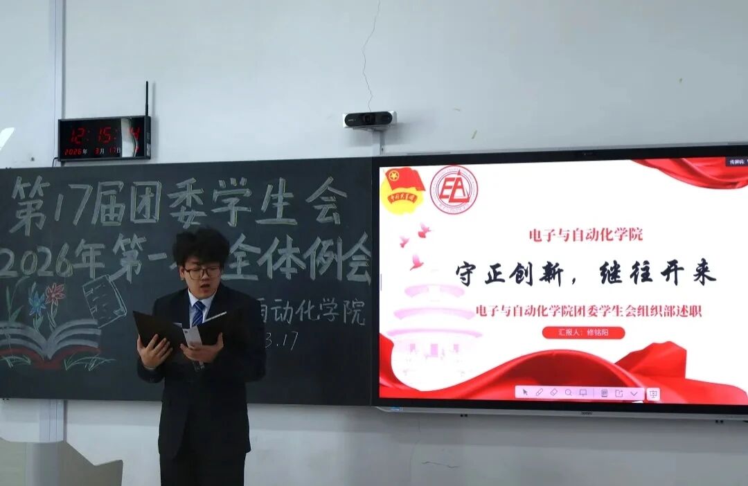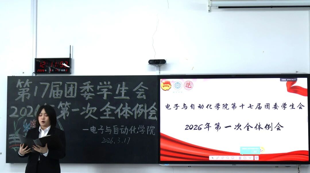 为进一步凝聚电子与自动化学院团委学生会工作合力,保障各项学生工作高效衔接、有序开展,电子与自动化学院于2026年3月17日中午12:10在思贤楼105召开第17届团委学生会2026年第一次全体例会。本次会议由团委副书记(学生)马靖雅主持。全体干部干事参会,共同梳理工作重点、明晰行动方向。