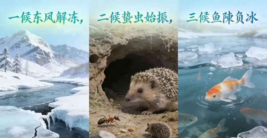 古人观天地、察物候,将立春的物候变迁凝练成三候:一候东风解冻,朔风渐次被东风取代,冰封的河川溪涧悄然消融,春水初融漾起粼粼波光;二候蛰虫始振,蛰伏地下一冬的虫蚁,因阳气渐生慢慢苏醒,在土中微动,静待破土而出的时机;三候鱼陟负冰,水底的鱼儿感知到水温回暖,溯水而上,游至薄冰之下,远望便似鱼儿驮着碎冰浮于水面,灵动又鲜活。