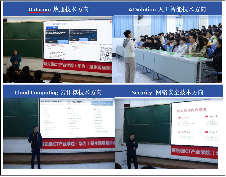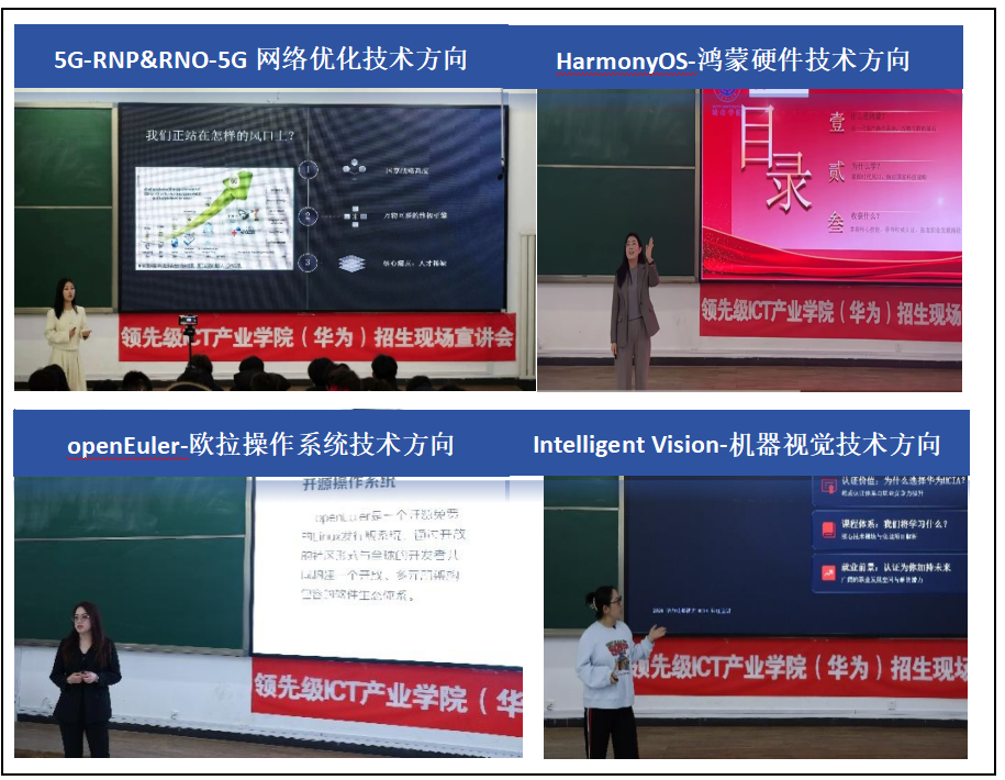 宣讲现场,华为ICT学院院长谢印庆等任课教师围绕华为ICT学院的办学背景、课程体系、华为认证体系以及未来发展方向进行详细讲解,让同学们深入了解行业发展趋势与人才需求标准。面向2025-2022级全体学生,本次招生覆盖八大技术方向,九个认证班。