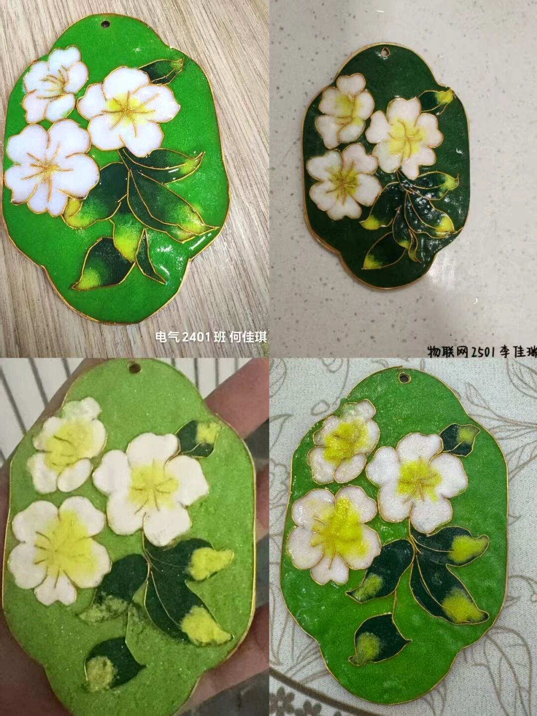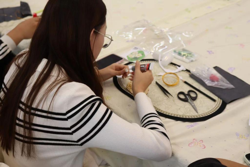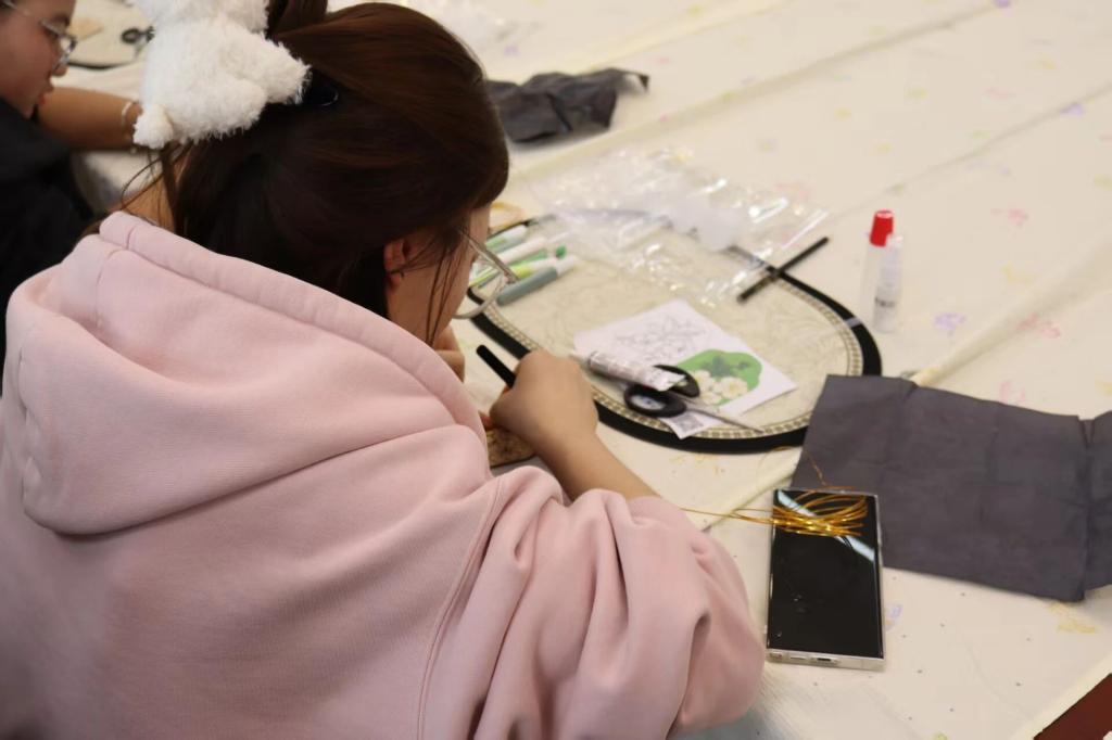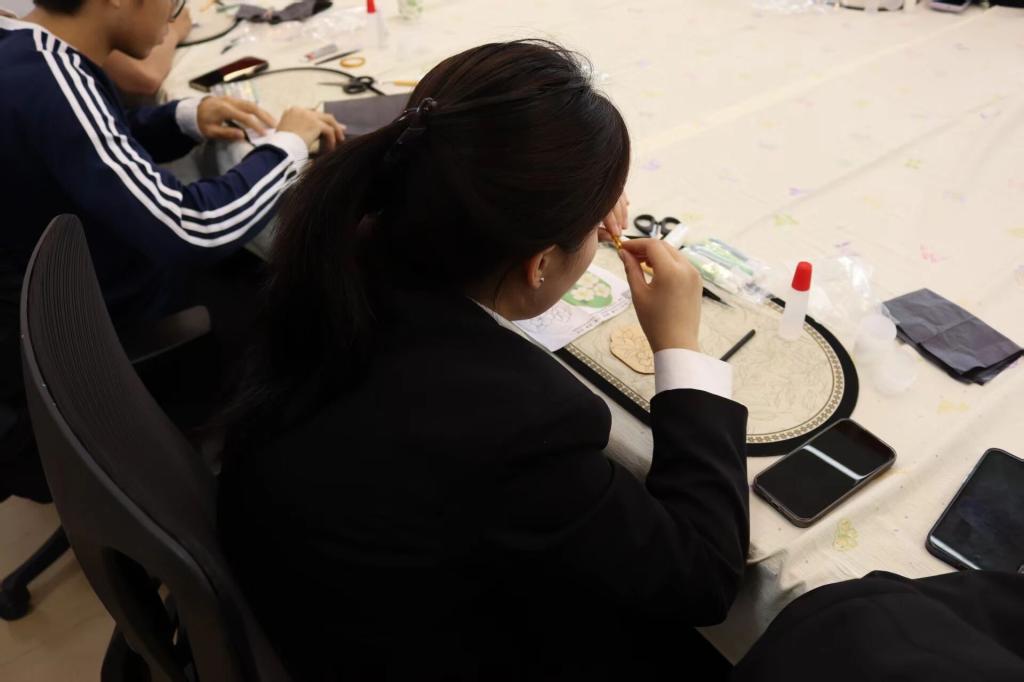 同学们对着图纸,手持金丝精准弯折、粘贴定型,以镊子细细调整纹样弧度,再用填釉笔蘸取彩料小心填充,指尖流转间尽显专注,匠心在每一个细致动作中悄然绽放。