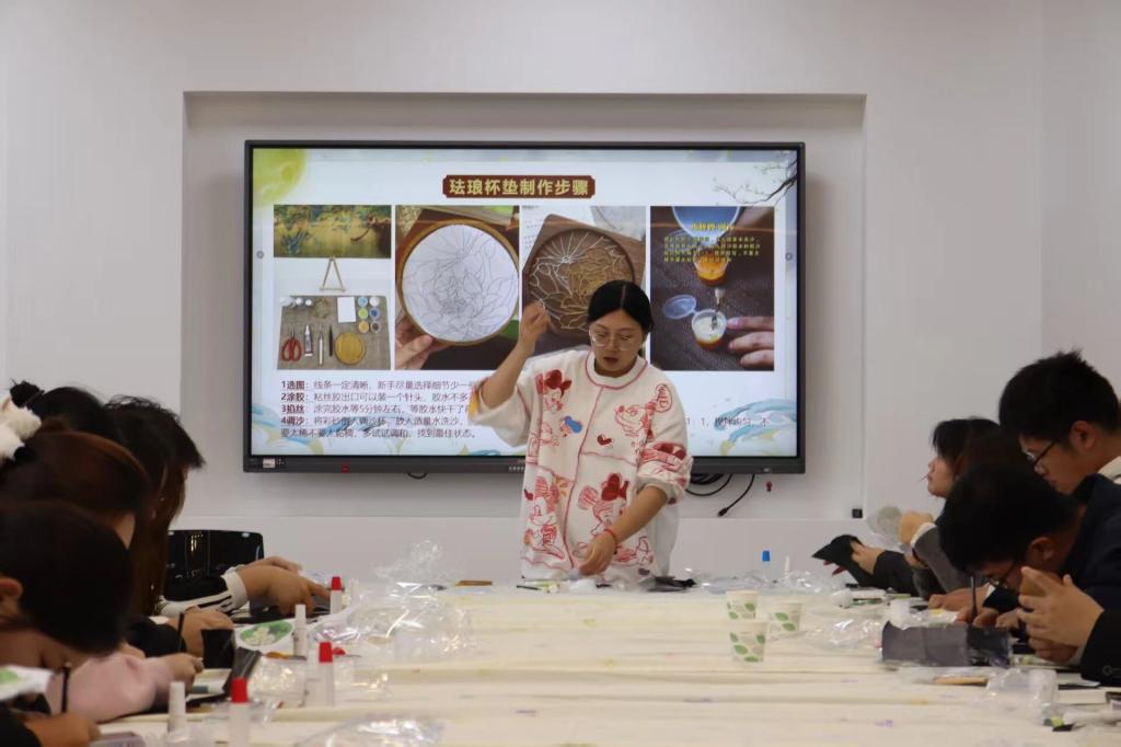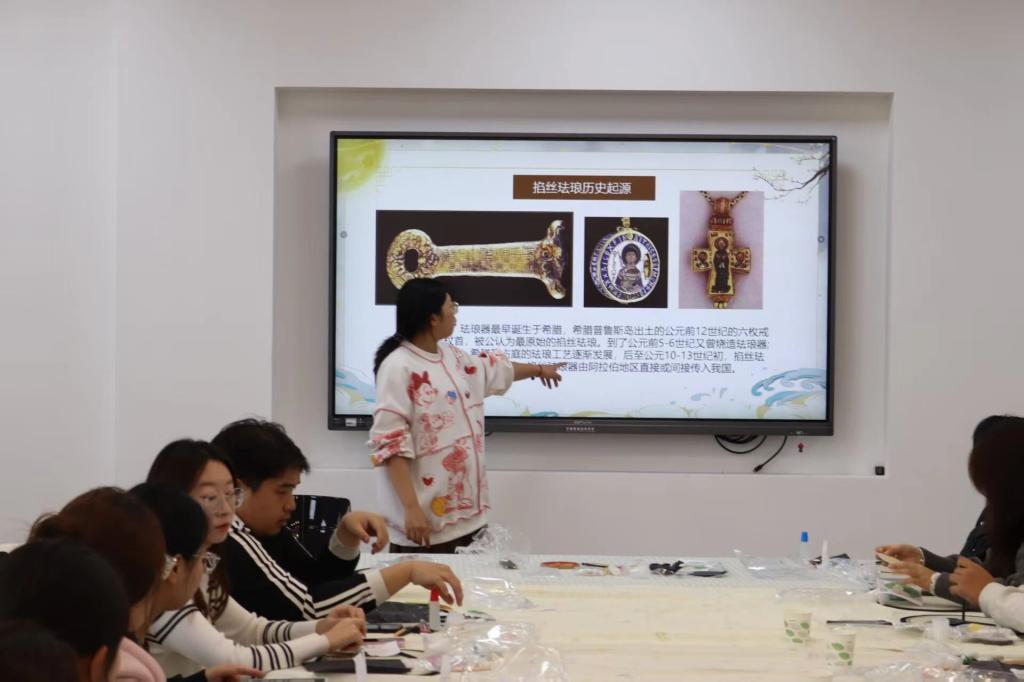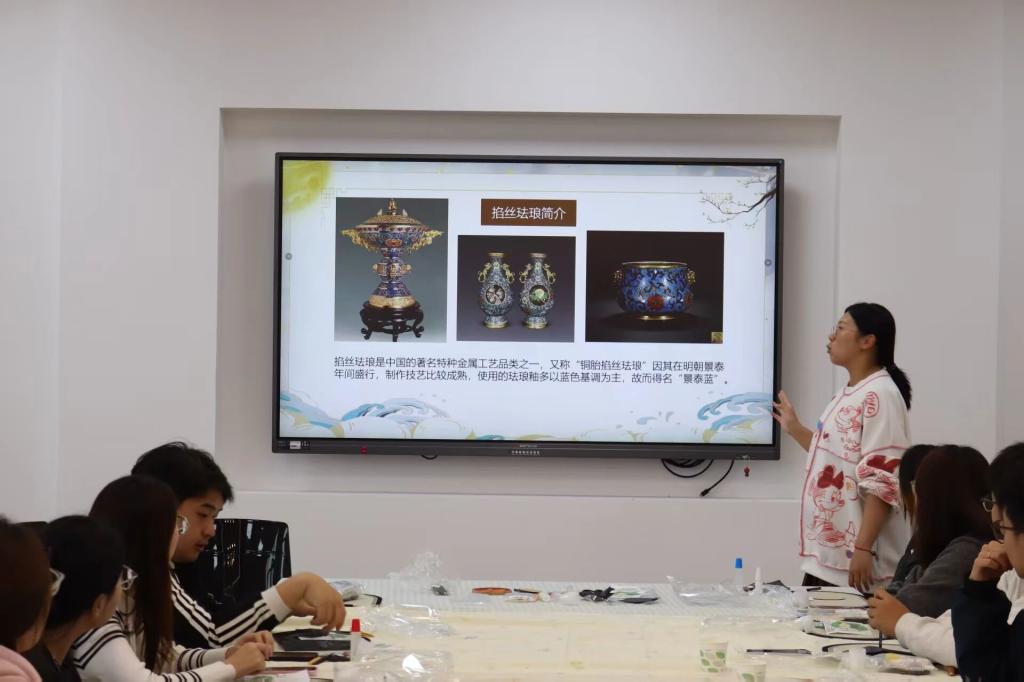活动伊始,宋佳老师以生动的讲解、鲜活的案例,从掐丝珐琅的核心简介、历史起源、文化价值及制作步骤等方面展开深入分享,带领现场同学全方位领略这门古老技艺的独特魅力,让大家沉浸式感受非遗文化的深厚底蕴。