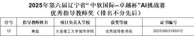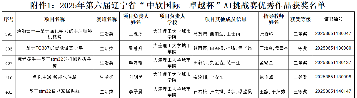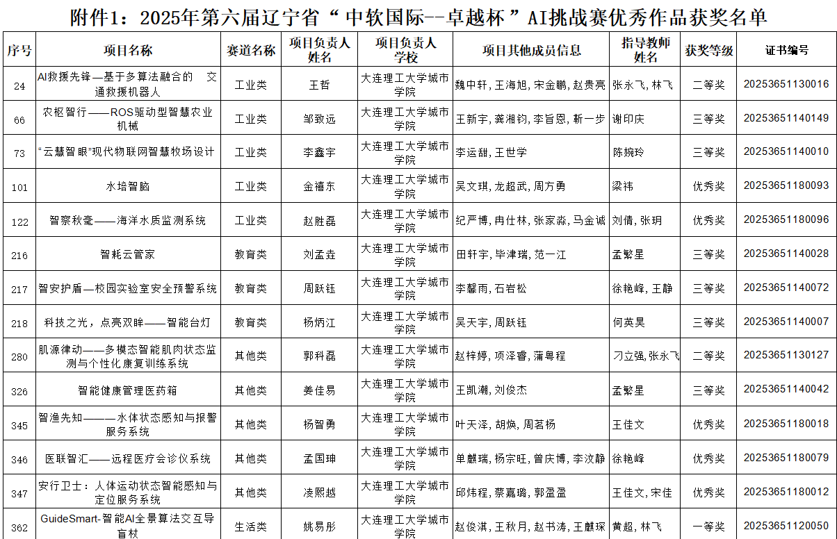 在2025年第六届辽宁省“ 中软国际--卓越杯 ”AI挑战赛中,电子与自动化学院共有19支队伍,合计78人获奖。在获奖队伍中,有1位教师获得省级优秀指导教师奖,省级一等奖1项,省级二等奖6项,省级三等奖7项,省级优秀奖5项。