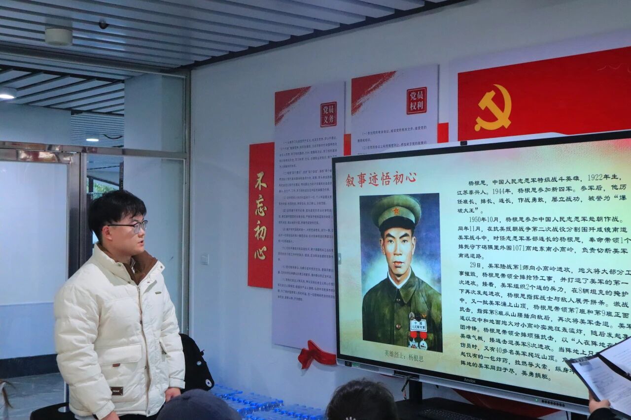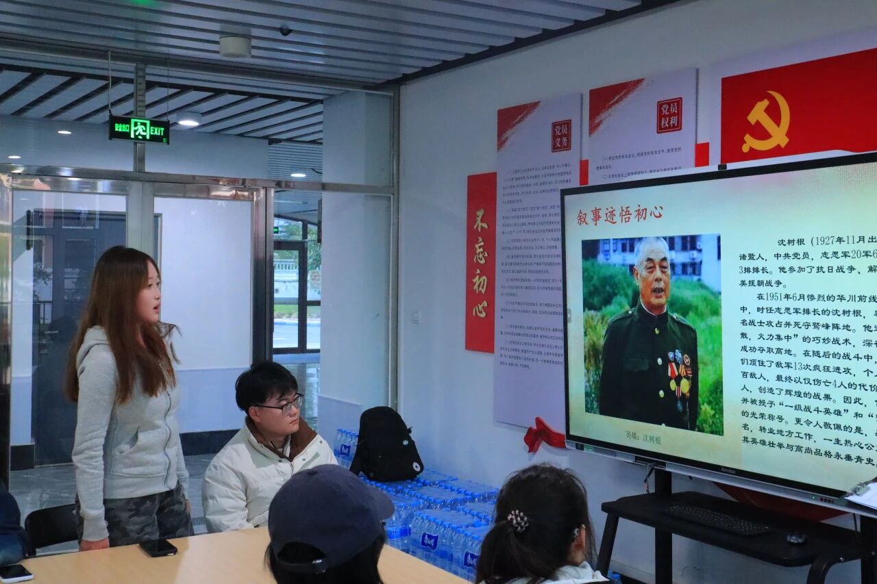 在“讲事迹悟初心”环节,杨根思、黄继光、沈树根三位英雄的感人事迹次第呈现。大家深刻感悟到英雄们矢志不渝的炽热初心,一幕幕动人故事引发强烈共鸣,英雄的精神力量如涓涓细流,汇入每位同学的心田,凝聚起奋进的磅礴力量。